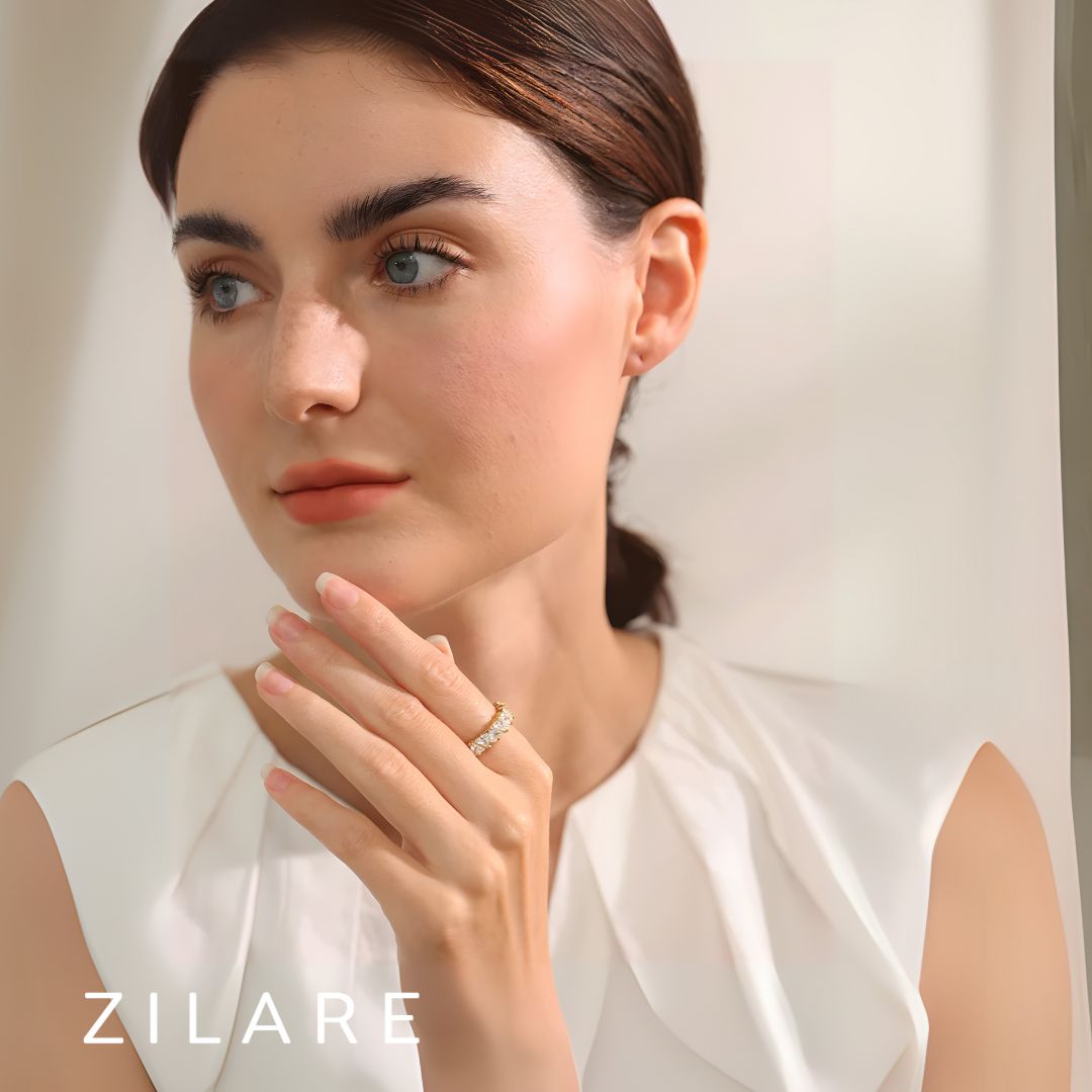 Un anillo luminoso y elegante que destaca por sus piedras en corte triangular, creando un diseño sofisticado y moderno. Perfecto para ocasiones especiales o elevar cualquier look diario.