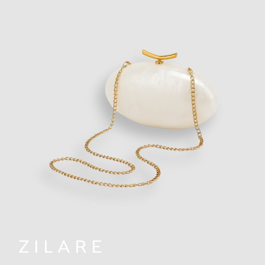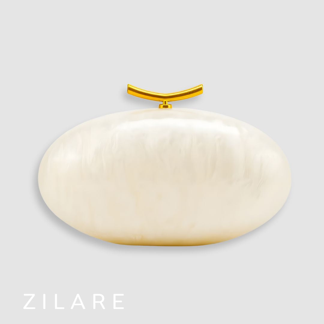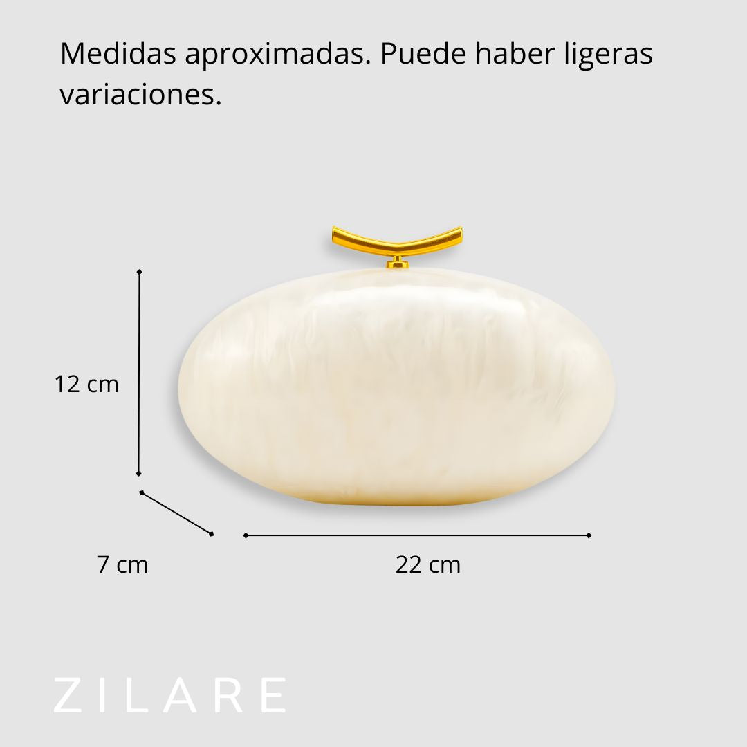 Un diseño sofisticado y moderno, ideal para ocasiones especiales. Su acabado nacarado marfil y el cierre dorado curvo crean un look elegante que destaca sin esfuerzo.