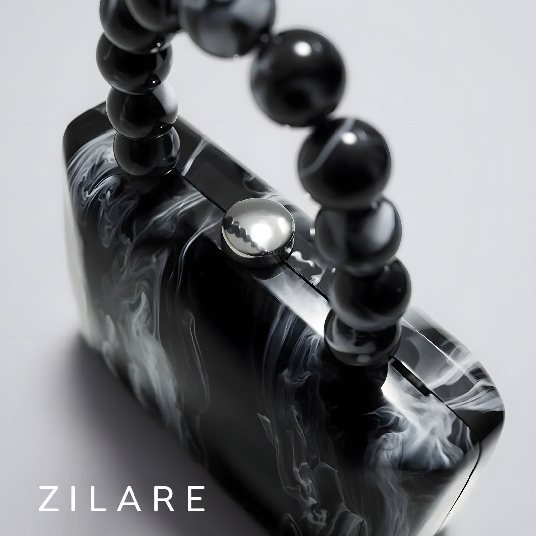 Un diseño moderno y sofisticado. Su acabado negro marmolado, la asa de esferas y la cadena dorada crean un look elegante.
