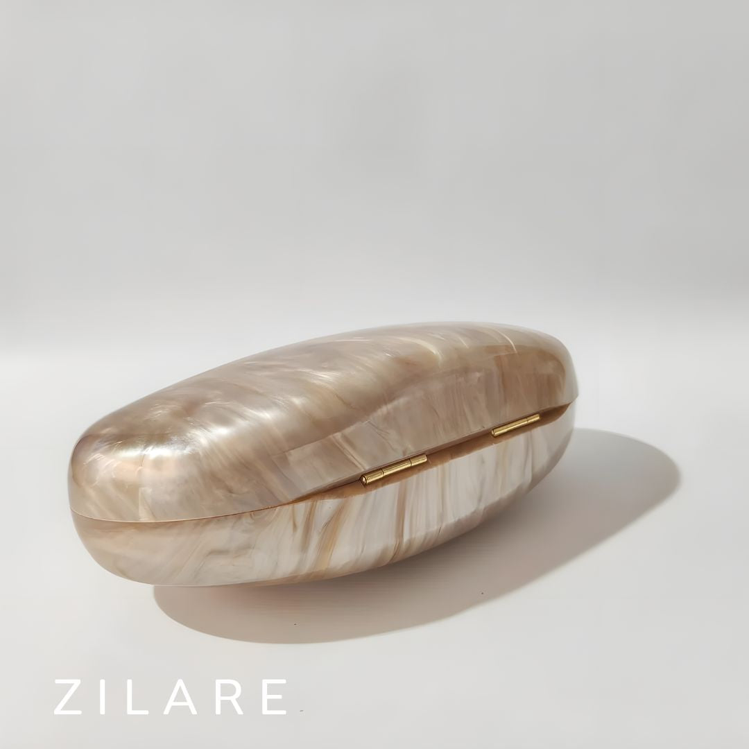 Con su acabado champagne marmoleado y forma redondeada, esta bolsa destaca por su estilo moderno y llamativo. Su estructura rígida y diseño suave.
