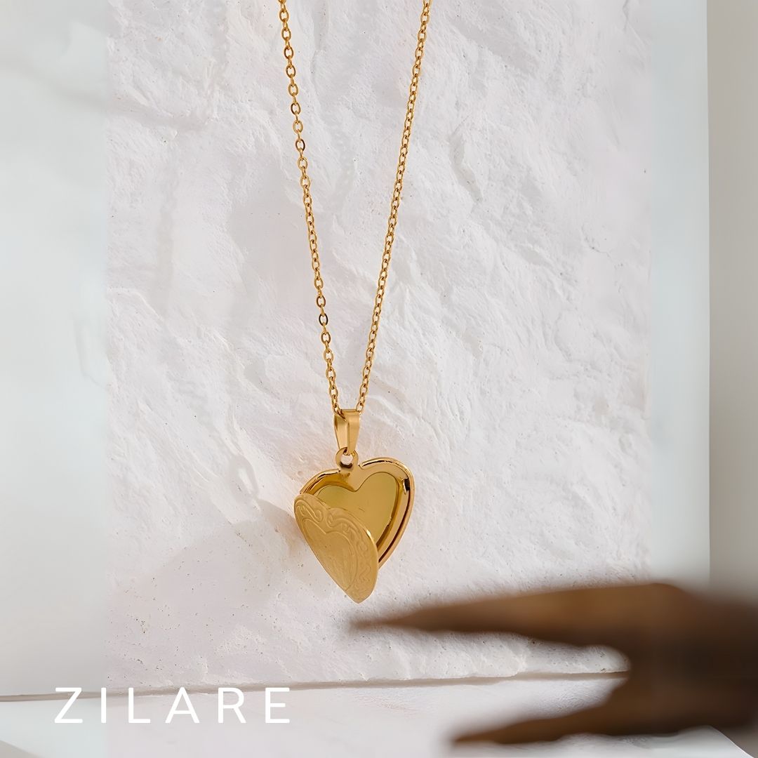 Un colgante con historia. Este collar dorado con medallón en forma de corazón guarda momentos especiales y combina elegancia con significado personal.