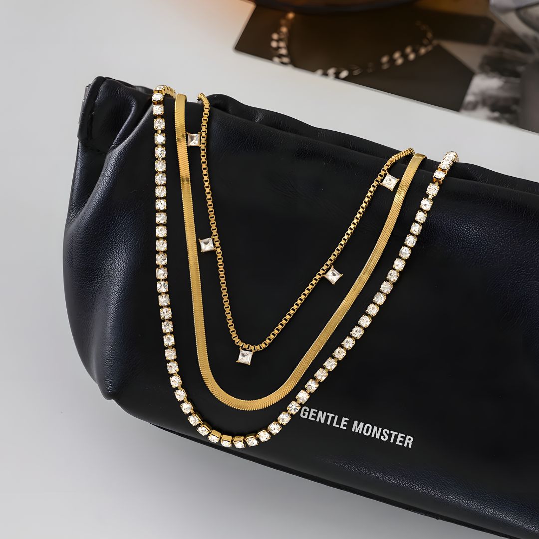 Un diseño sofisticado y brillante con tres cadenas de estilos distintos. Su combinación de formas y reflejos crea un toque audaz y refinado ideal para toda ocasión.